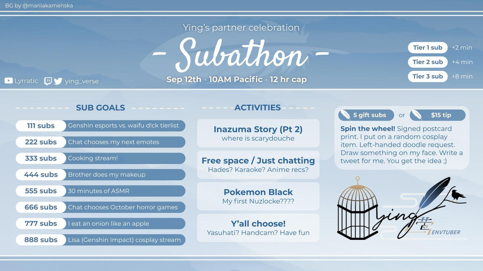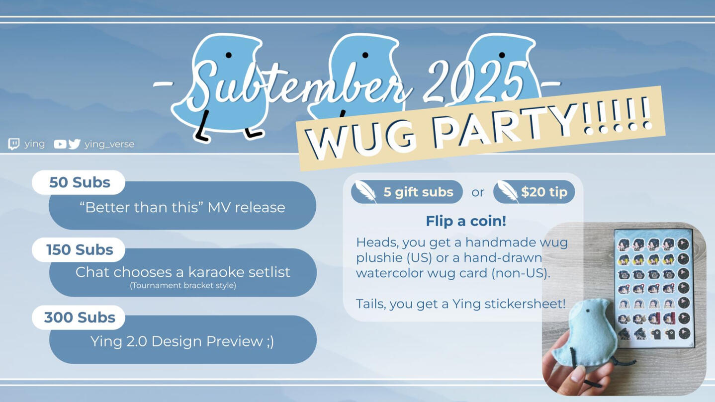 Hi! I'm Ying, a vocalist, cosplayer, and hybrid VTuber/facecam streamer. Welcome to the flock!For business inquiries, please email [email protected].(Art by @minipuffins)