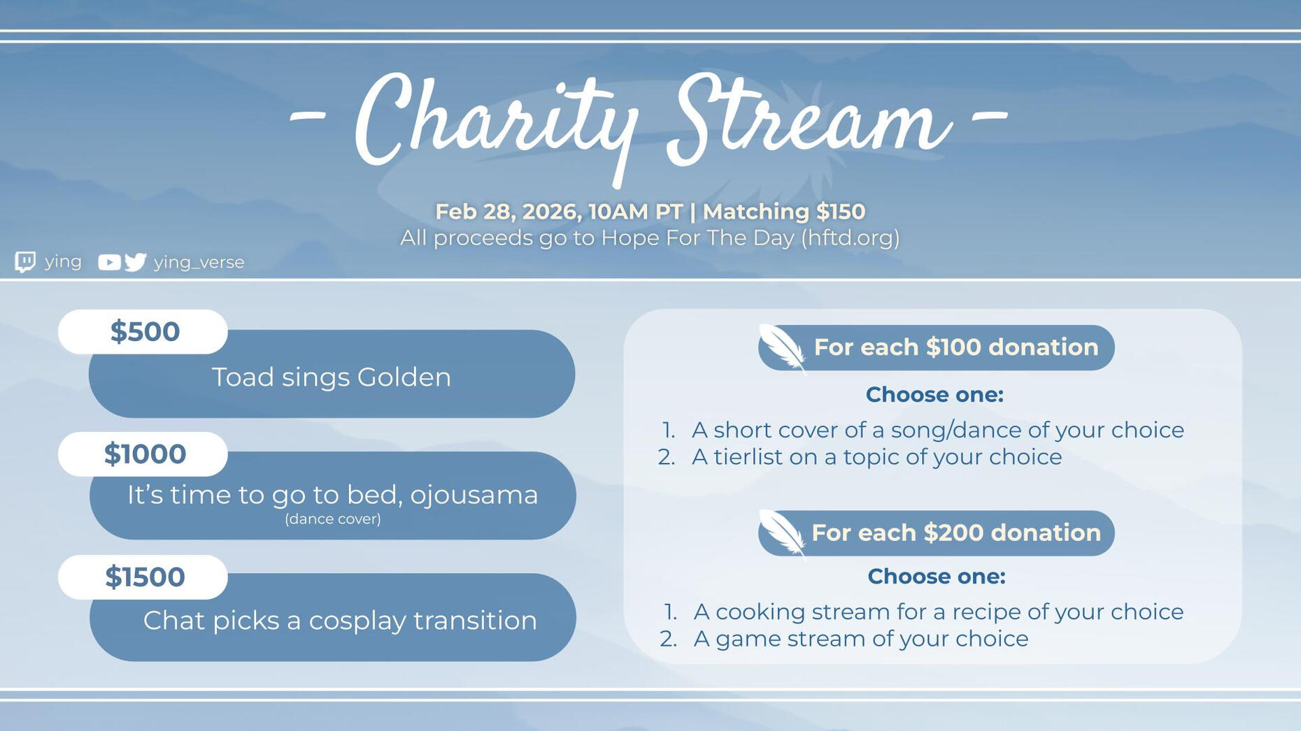 Hi! I'm Ying, a vocalist, cosplayer, and hybrid VTuber/facecam streamer. Welcome to the flock!For business inquiries, please email [email protected].(Art by @minipuffins)